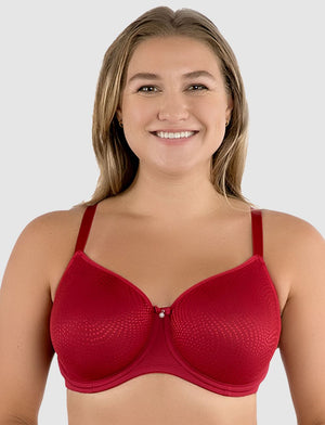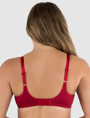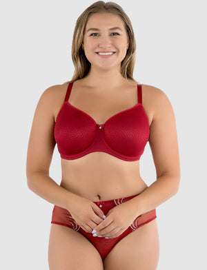 The Parfait Pearl in the Rio Red colourway, has smooth, double lined, non-padded cups with internal side slings which combined, minimizes bust up to one cup size. Microfiber centre front and back enhances the ultimate comfort of this gorgeous style. A perfect everyday bra for all your outfits!