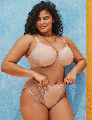 The Elomi Charley Bandless Spacer Moulded Bra is a fantastic T-shirt bra in Fawn! Featuring seamless and ultra-light moulded cups designed with spacer material to help provide amazing breathability and comfort for everyday wear. Wires provide separation and create a beautiful round shape.