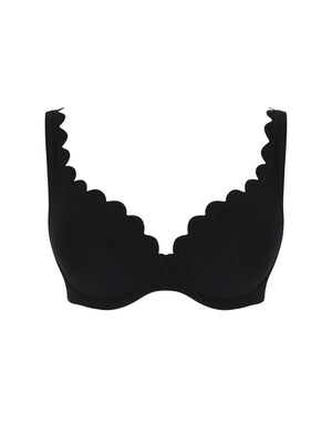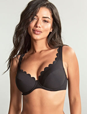 Take your beach look to the next level with the Panache Spirit Lauren Plunge Bikini Top! This chic black top features a plunging neckline for a touch of glamour and scalloped edges for a playful charm.