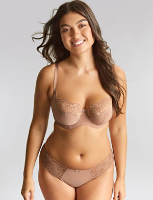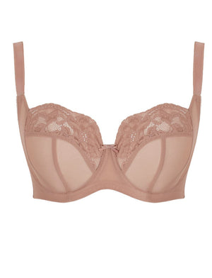The Panache Nina Balcony bra is the perfect bra for those who love the fit of a balcony bra but the coverage of a full cup. This style boasts sheer mesh cups with a stretch lace at top of cups for a comfortable fit.