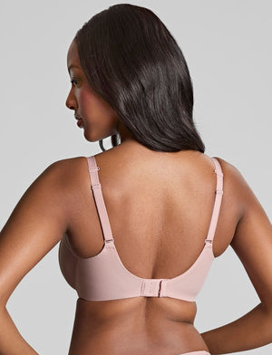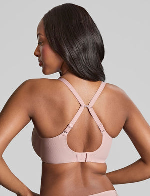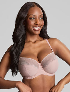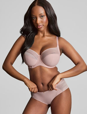 The Serene Full Cup Bra by Panache is a strong and supportive full cup bra that has been constructed from recycled fibres throughout. It features geometrically patterned elastic lace across the cups, now in a new 'Vintage' pink shade, whilst perfectly shaping and lifting.