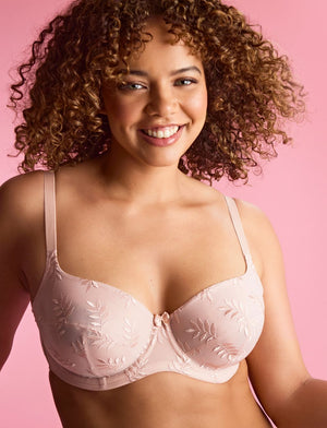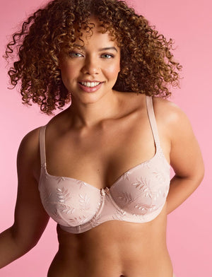 The Panache Tango Balcony Bra in Blush blends full coverage with a playful leaf embroidery design. Its lined bottom cups provide extra support, while the double-layered sheer fabric adds a touch of elegance. Perfectly crafted for comfort and lift up to a K cup.