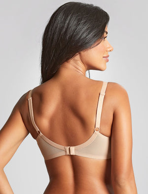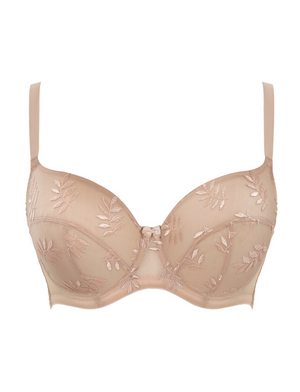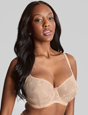 The Panache Tango Balcony Bra in Honey blends full coverage with a playful leaf embroidery design. Its lined bottom cups provide extra support, while the double-layered sheer fabric adds a touch of elegance. Perfectly crafted for comfort and lift up to a K cup.