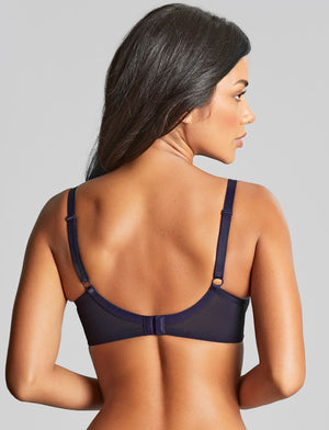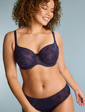 The Panache Tango Balcony Bra in Navy blends full coverage with a playful leaf embroidery design. Its lined bottom cups provide extra support, while the double-layered sheer fabric adds a touch of elegance. Perfectly crafted for comfort and lift up to a K cup.