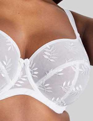 The Panache Tango Balcony Bra in White blends full coverage with a playful leaf embroidery design. Its lined bottom cups provide extra support, while the double-layered sheer fabric adds a touch of elegance. Perfectly crafted for comfort and lift up to a K cup.