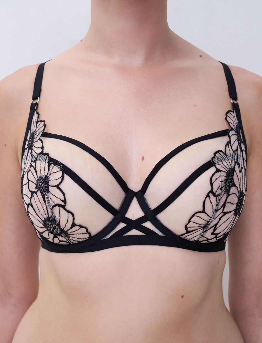 Introducing the alluring Chantelle Pulp Lush Full Cup Bra. With a combination of daring black daisy embroidery and delicate satin, this bra's soft pink unlined cups provide natural lift and support.