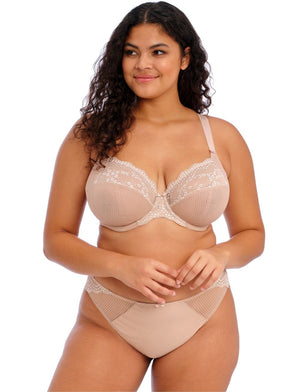 Charley is a feminine collection by Elomi that has delicate flower embroidery combined with a light diamond mesh fabric. The Charley Stretch Plunge bra in soft Fawn, has the top cup cut from stretch lace to create a round shape and a plunging neckline.