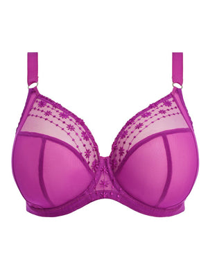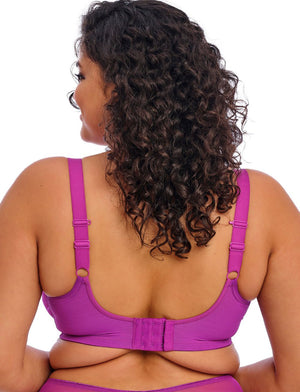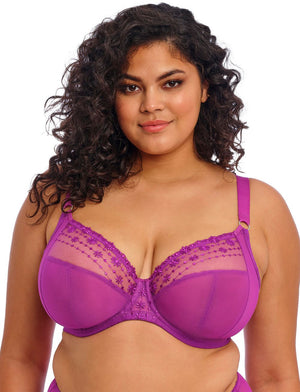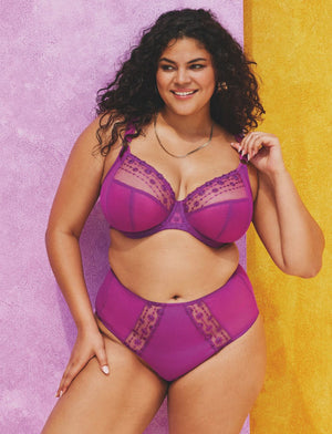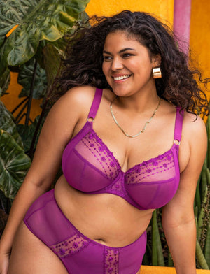 The Matilda plunge bra is so popular, fashion colours dropping sell fast. The Matilda will provides not only a really great lift, you will also feel secure and held in. That doesn't always happen with a plunge. Somehow Elomi have managed to create a plunge that separates and holds everything in place. The Hollyhock colourway, is a retro-inspired rich purple shade. Enhanced with daisy-chain embroidery and a subtle shimmer lurex thread, this bra is perfect for adding a touch of disco glam!