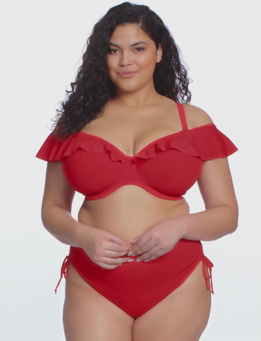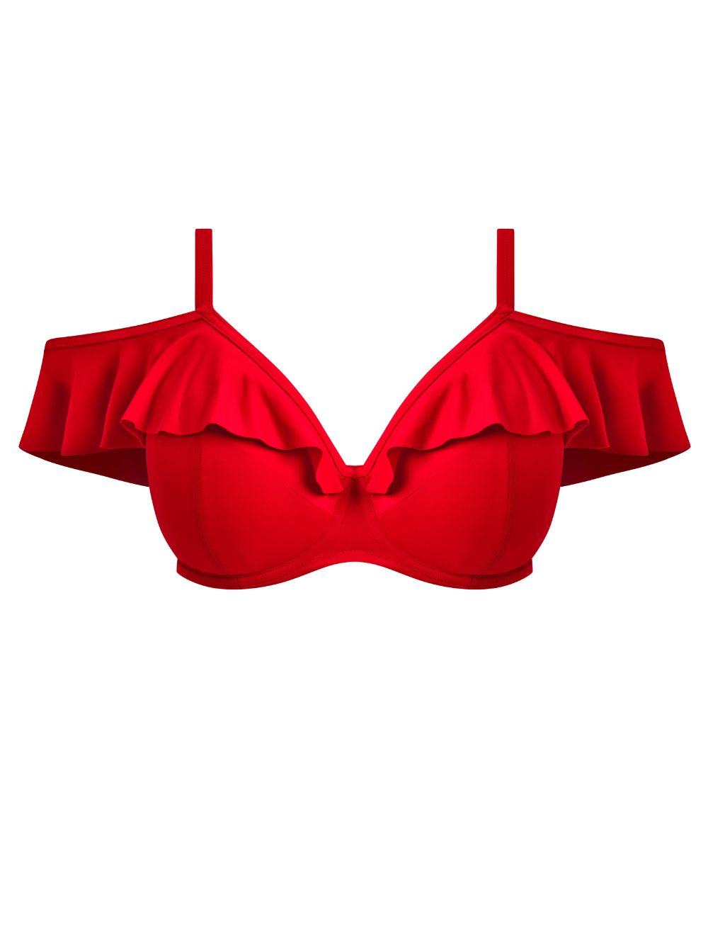 Make a splash with the Elomi Plain Sailing UW Frill Plunge Bikini Top in Lava! Whether you wear it on or off the shoulder, its ruffle detail and flattering plunge bring a fun in the sun vibe to your swimwear. The underwire offers reliable support, so you can enjoy beach days or poolside lounging with confidence and style.