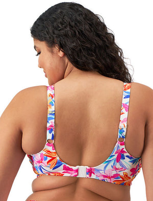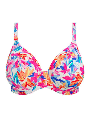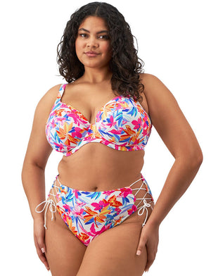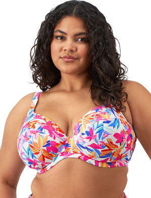 Add a pop of colour to your beach look with the Elomi Savaneta UW Plunge Bikini Top. This playful top features a vibrant tropical print with peony pink florals on a fresh white background. Perfect for standing out on your next vacation!