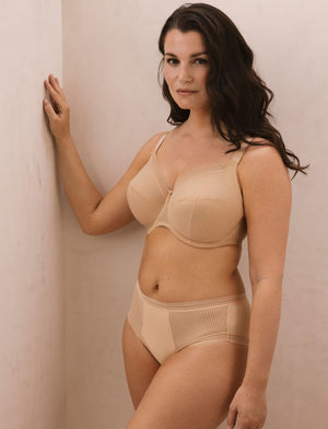 Modern, contemporary and elegant... Fantasie brings you the Fusion UW Full Side Support Bra in this versatile sand shade. Designed with comfort and function in mind, Fusion boasts a wide underwire and strong side panel to help pull the bust to the front of the body. The 4 part cup encapsulates the bust to give a rounded and forward projected shape. Finished in a beautifully soft to touch jacquard fabric, Fusion is a classy, easy-to-wear everyday staple, all the way to a HH cup.