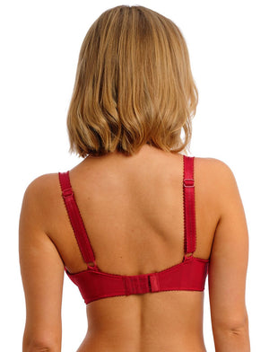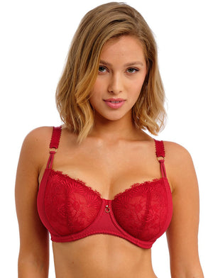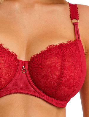 Elevate your lingerie collection with the Freya Fascinate UW Balconette Bra in Cherry. This playful piece boasts a stunning lace floral design enhanced by delicate mesh and eyelash edging, adding a flirty, sexy touch. Its balconette shape provides gentle lift and natural cleavage, perfect for those who love both style and support.