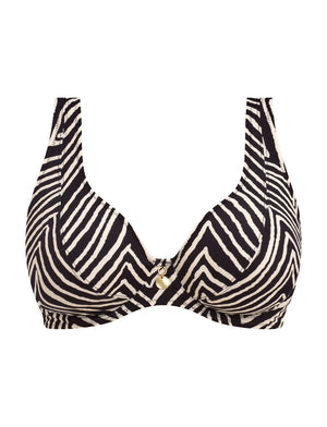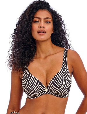 Make a bold splash with the Freya Fiji Falls UW High Apex Bikini Top in black, featuring a striking zebra-inspired print. Its low plunge neckline combine playful style with confident support, while the high apex cups lift and shape for a flattering fit. Perfect for standing out poolside or on the beach!