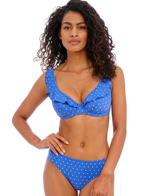Classic, flattering and playful, the Jewel Cove High Apex Bikini Top by Freya is bound to give you a whole new wave of poolside confidence this summer! Featuring a waterfall frill along the neckline, this style is sexy yet elegant and allows for a lovely round shape and amazing lift and support. Available in the refreshing Azure blue colour with white diamond pattern!
