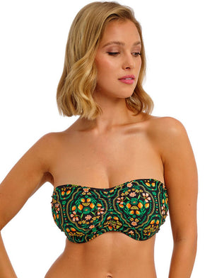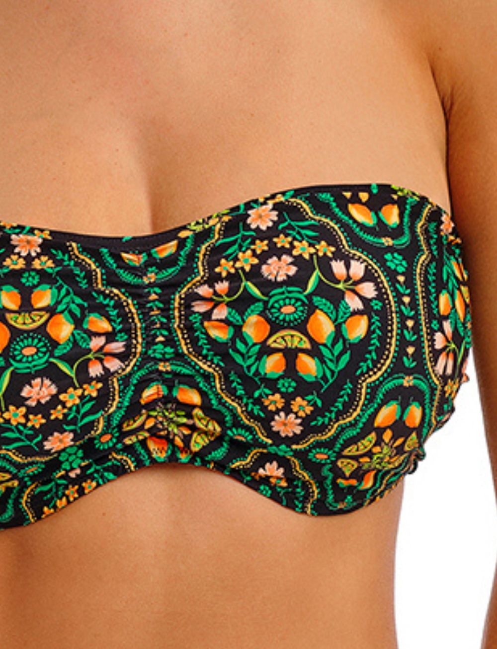 Head into summer with with this stunning bandeau bikini top from Freya's Sunset in Seville collection! The Santa Ana print is inspired by citrus groves and traditional Andalusian tiles, it features vibrant jade, zesty citrus tones, and golden hues dancing across a sleek black base. The versatile multi-way design lets you customize the fit to match your unique style! Perfect for those who crave effortless style with a touch of Mediterranean magic.