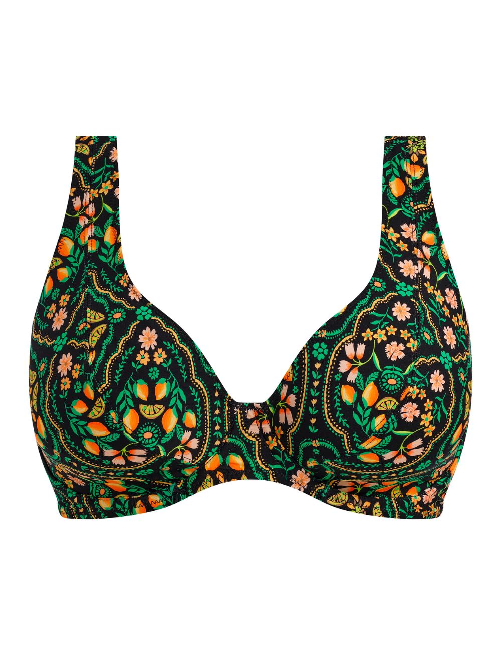 Introducing Freya's Sunset in Seville High Apex Bikini Top, the Santa Ana print features a captivating blend of jade, citrus zest, and golden accents dancing across a sleek black base—reminiscent of traditional Andalusian tiles and dreamy citrus groves. The supportive high apex design delivers confident lift and shape, while the clever J-hook allows you to switch to a racerback style whenever the mood strikes!
