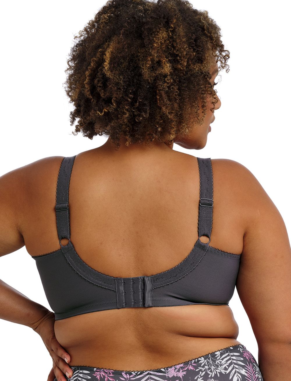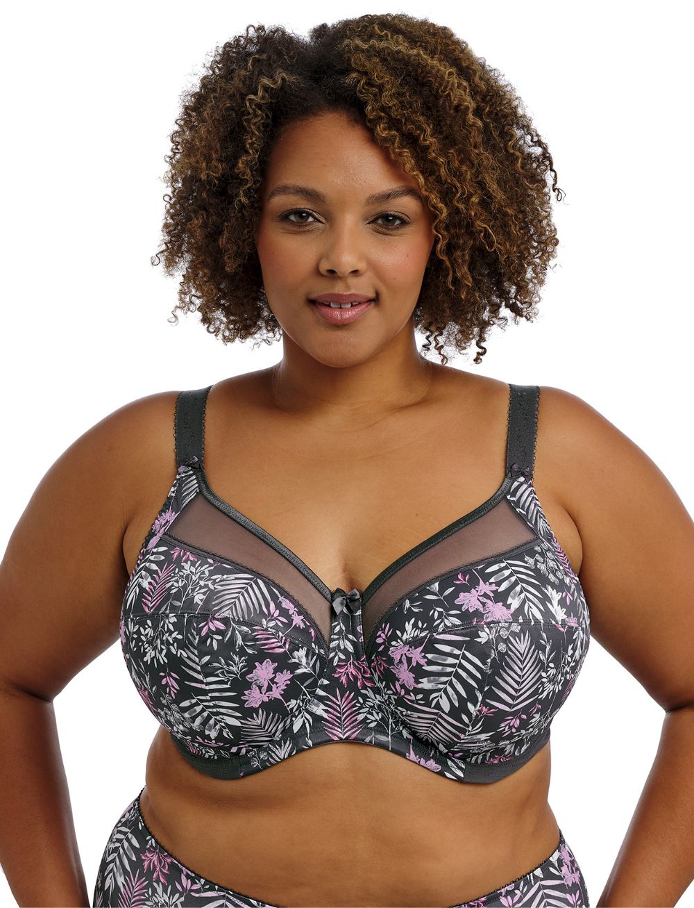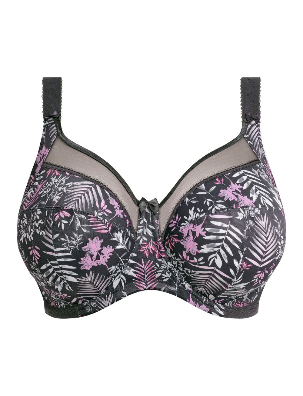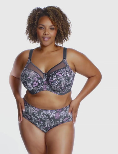 The Goddess Kayla Full Cup Bra in Charcoal features a sheer top cup with a flirty V-neck plunge shape, giving you a lighter feel and a beautifully flattering neckline. Its playful leafy print in pinks, lilacs, and turquoise dances across a dark grey base, making every wear feel vibrant and fun while offering full support. Elevate your lingerie game with a bra that’s as charming as it is comfortable.