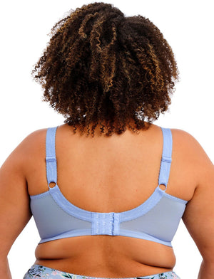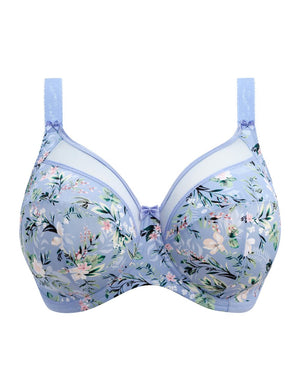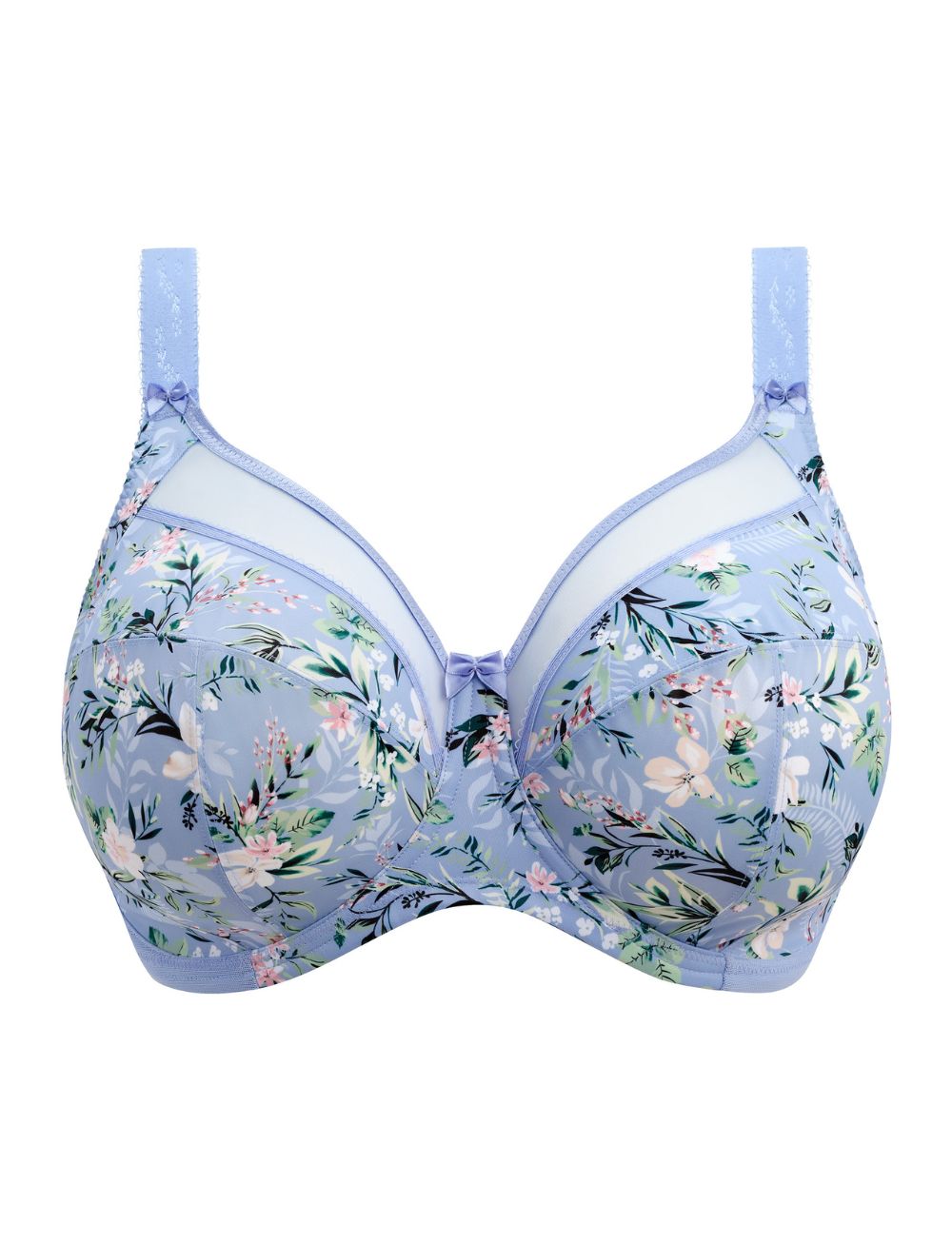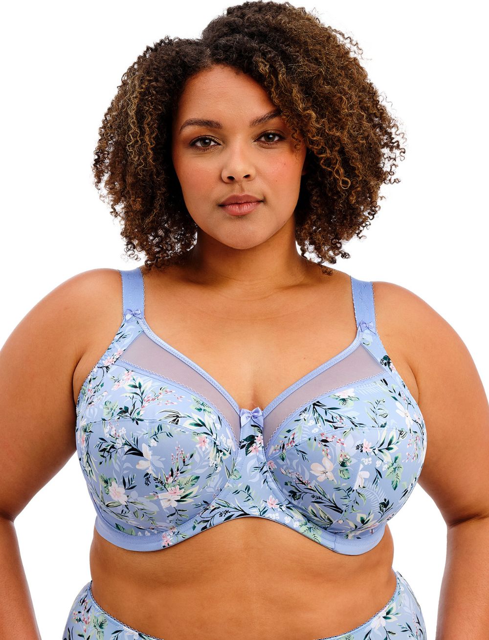The Goddess Kayla Full Cup Bra in Cornflower features a sheer top cup with a flirty V-neck plunge shape, giving you a lighter feel and a beautifully flattering neckline. Its playful floral and leafy print in greens and ivory dances across a light blue base, making every wear feel vibrant and fun while offering full support. Elevate your lingerie game with a bra that’s as charming as it is comfortable.