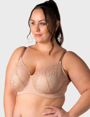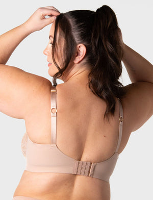 The Hotmilk Evolve Refined Full Cup Bra in Cashmere lifts and shapes while staying incredibly comfortable—the lightweight mesh-lined cups and sumptuous lace work together to create a flattering silhouette that adapts to your every move. The flexiwire provides secure support and features an easy-to-use J-hook for a versatile racerback option.