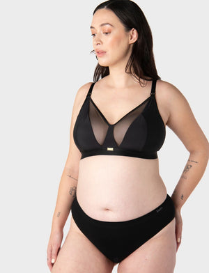 Stay comfortable and supported with the Hotmilk Flawless Full Cup Plunge Nursing Brain Black! Designed with mums in mind, this bra offers wirefree support up to a J cup with its 3-piece cup panels and soft power mesh. The sheer plunge neckline and double-layered sides and back provide a lightweight and smooth look.
