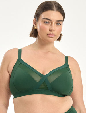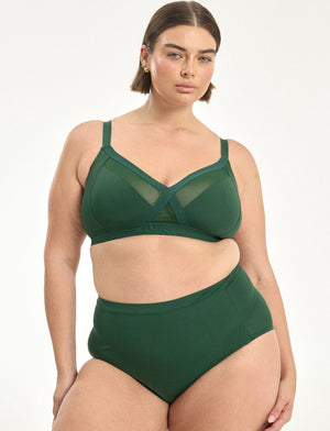 The Nala Support Wirefree Bralette...no wire, full lined supportive cups and free from harmful chemicals and toxins. It has it all! Designed to sculpt and enhance your natural shape, perfect for everyday uplift or lounging around. Get yours now in the limited lush green colour - Poison Ivy!