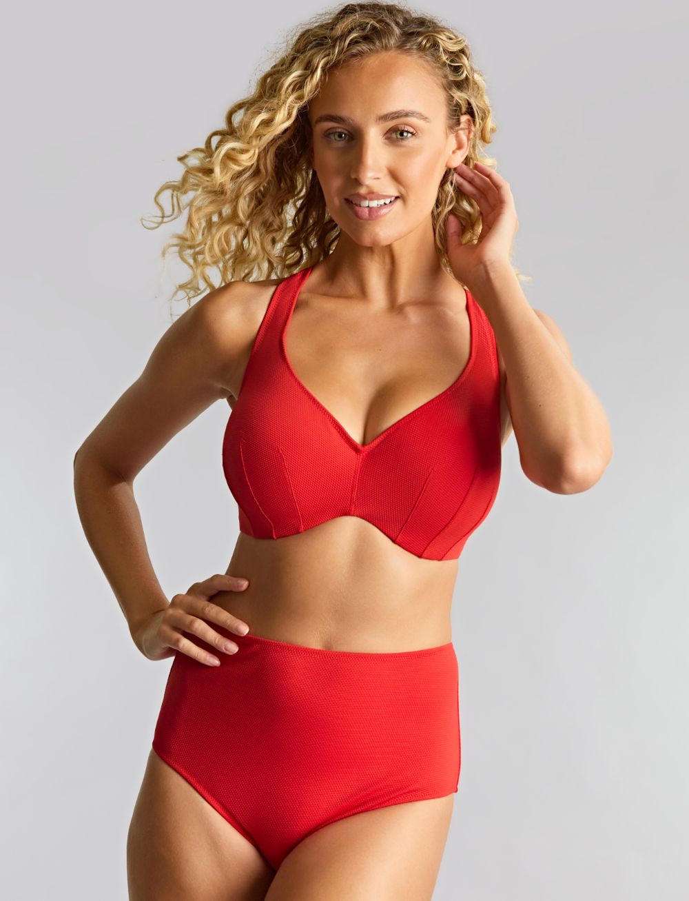 Dive into sunshine vibes with the Panache Aurora Jennifer Plunge Bikini Top in radiant Red. Featuring a honeycomb textured fabric, it offers both style and a comfortable fit. The versatile racerback option lets you switch up your look effortlessly and flatter your silhouette with the plunging neckline that adds just the right touch of allure!