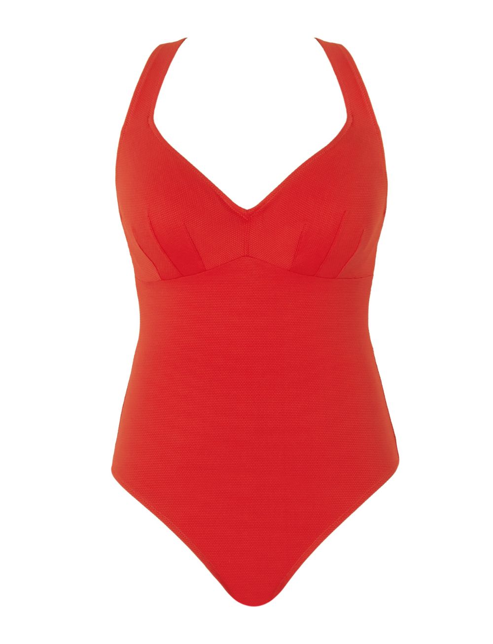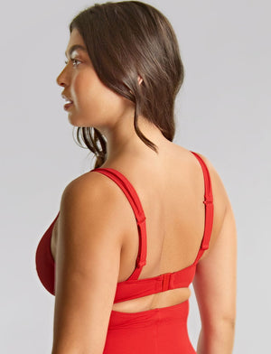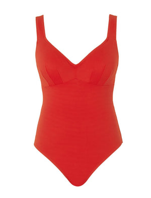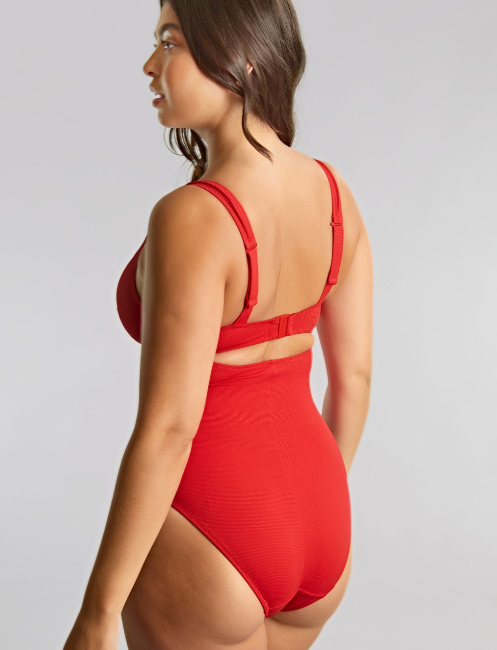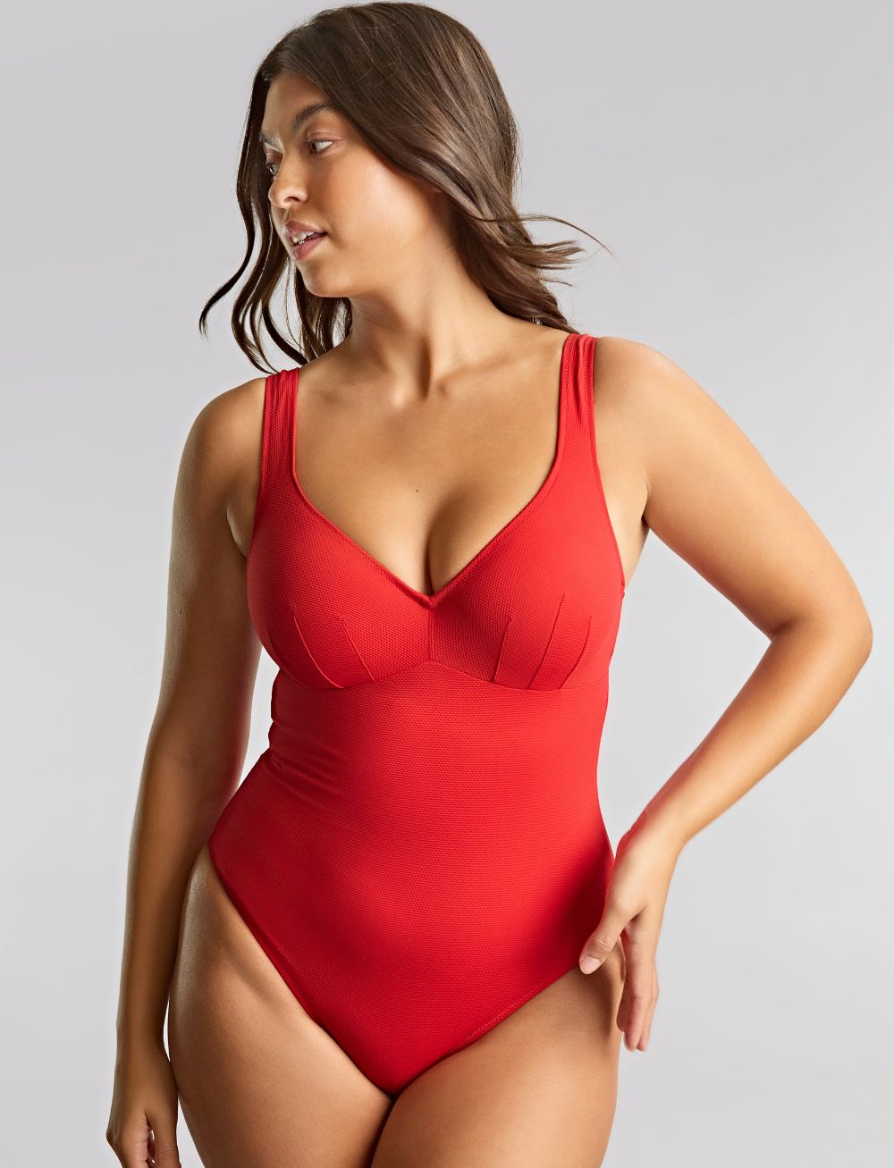Make a splash with the Panache Aurora Lara Plunge Swimsuit in this fiery Red! Featuring a flattering plunge neckline and a honeycomb textured fabric, this suit highlights your curves. The racerback design brings a sporty twist and extra support, plus gentle tummy control helps you feel confident and comfortable all day at the beach or pool.
