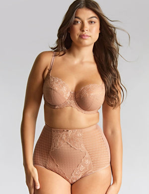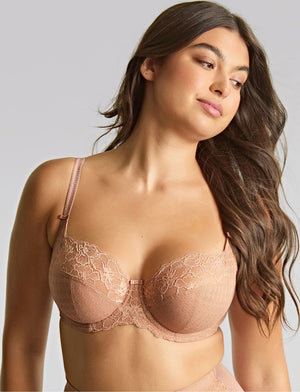 The Panache Envy Full Cup Bra offsets floral lace with an edgy hounds-tooth pattern for a stunning result. Designed with a balconette neckline and firm back band, this bra offers full-cup coverage and support for everyday wear. Available in a soft Honey shade, this is a fitters' favourite and perfect everyday staple.