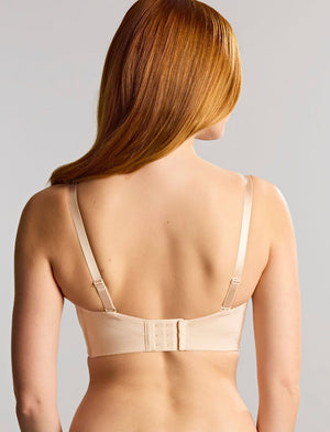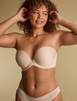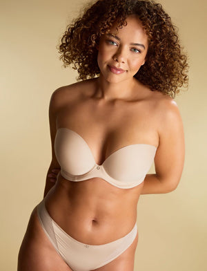 The Faith Moulded Plunge Strapless Bra by Panache is the perfect strapless option for every bra-drobe! It features a deep, plunging neckline, smooth moulded cups and detachable straps for a multiway option-available in a versatile latte nude colourway.