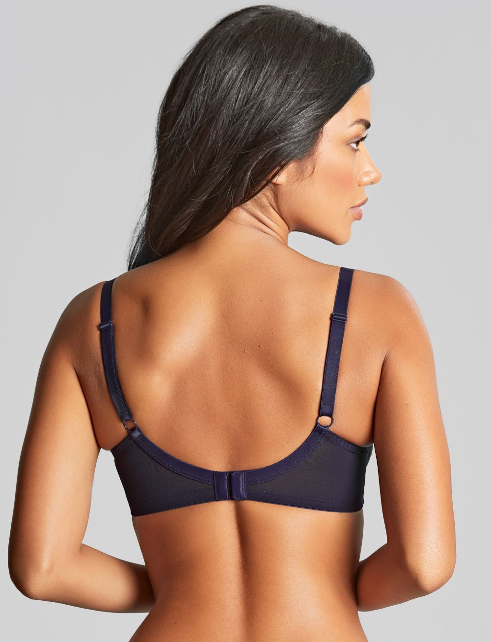 The Tango features a sheer double layered fabric with an elegant embroidered leaf design with a full coverage cup. A best seller and legacy style from Panache, available in a a deep Navy shade. Great lift and support up to a K cup.