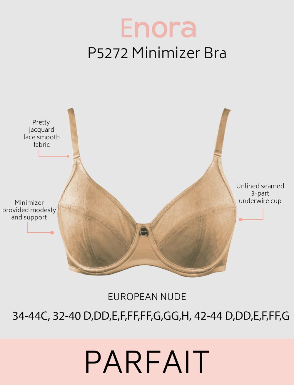 Sculpt a sleek, confident silhouette with the Parfait Enora Minimiser Bra in European Nude! Featuring 3-part underwired cups that reduces projection, it provides firm support while smoothing and shaping for a flawless look under fitted clothing.