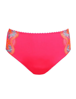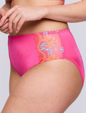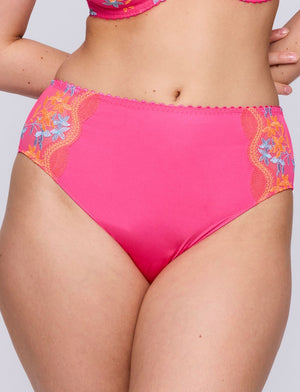 The matching full brief from Primadonna's Cala Luna collection in bright and bold Blogger Pink! This high-waisted brief features playful orange and blue floral embroidery for a fun and flirty touch.