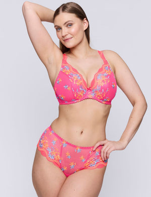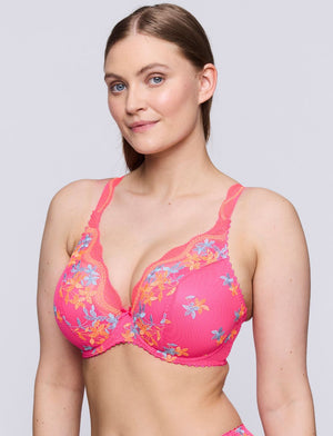 Introducing the Primadonna Cala Luna Half Padded Plunge Bra in lively Blogger Pink! With captivating floral embroidery in vibrant oranges and blues, against a hot pink base, this bra is playful with the plunging V-neck that adds a touch of sexiness to your everyday wardrobe.