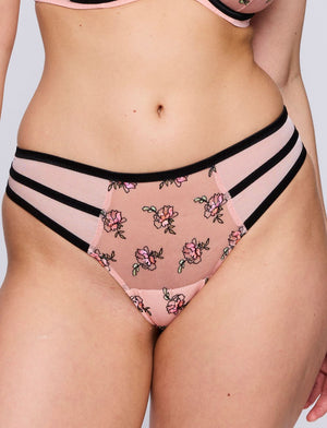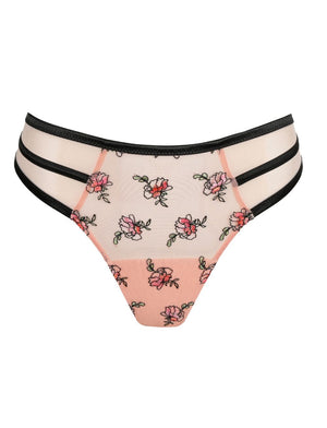Pair up this Thong with the Primadonna Eraclea collection in the delicious Parfait colour. Showcasing a beautiful floral embroidery and black contrasting piping, this piece has an air of elegance and femininity.