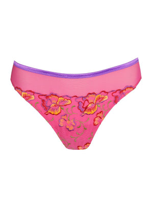 The Primadonna Devdaha Thong in Very Berry features vibrant orange, green & lilac floral embroidery on a fuchsia background. With its minimal rear coverage and playful design, this thong offers a flirty and confident fit that adds a burst of colour to your lingerie collection.