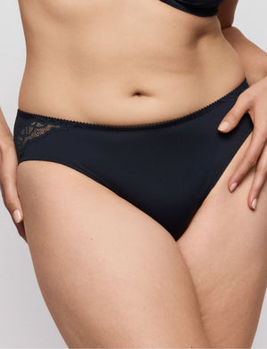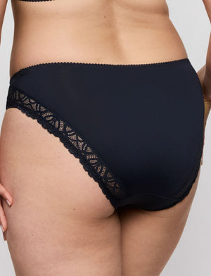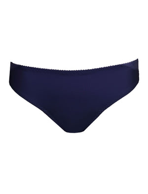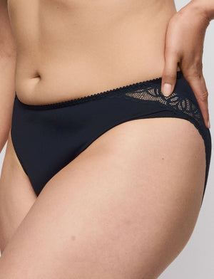Introducing Primadonna Salerno Rio Briefs in Midnight Blue. These briefs combine luxury and fun with a smooth fabric and delicate lace panel that contours your body. Perfect for adding a playful touch of femininity to any look.
