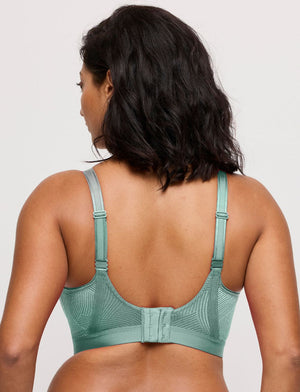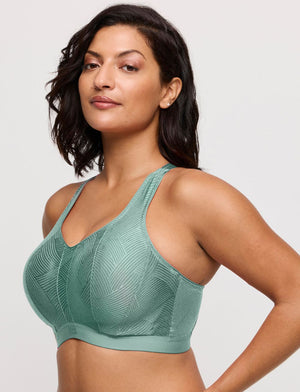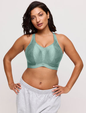 Make a confident choice for comfort and style with the Primadonna The Game Sports Bra in the Sage colourway. This is a trendy, non-moulded sports bra with a stunning graphic lace overlay. Its versatile straps can sit comfortably over your shoulders or cross at the back, letting you switch up your style. Perfect as an underwire sports bra, wear it solo as a sports top or layered beneath your favourite tops.
