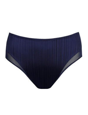 Slip into the Primadonna Twist Knokke Full Briefs in Sapphire Blue for a playful touch of elegance. Featuring a sheer mesh panel tracing the leg line and a subtle pin-stripe pattern, these briefs combine comfort and smooth coverage while celebrating your confident style every day.