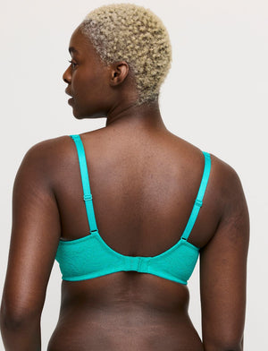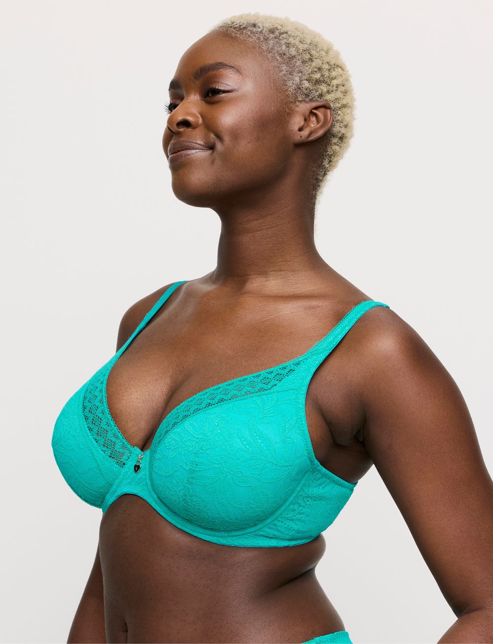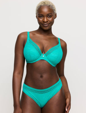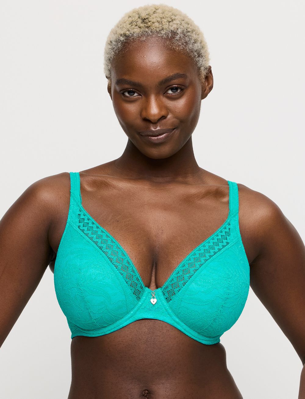 Revamp your lingerie collection with the Primadonna Twist Palermo Half Padded Plunge Bra in a vibrant Sunny Teal shade! Indulge in the retro lace and a hint of French chic, adding a flirty edge to your everyday look.