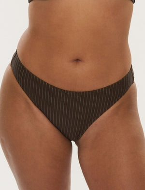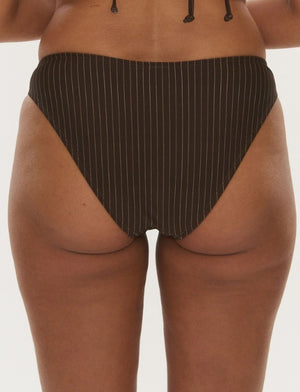 The RAQ 90s Brief offers moderate coverage with a flattering rear cut. The high leg elongates your leg, and sits in the perfect spot below the belly button and high on the hips. You'll love the poolside 90s vibes, in a stunning Choco Pinstripe!