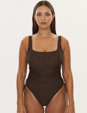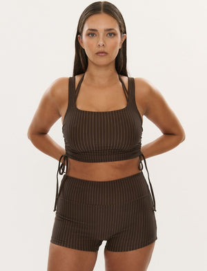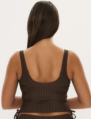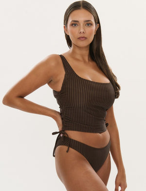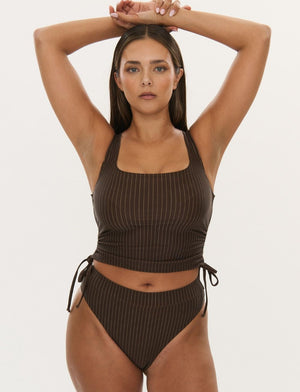 The RAQ Singlet Top in Choc Pinstripe is a playful and versatile cover-up designed for fun beach days. Featuring custom length with side drawstrings, it lets you tailor your look effortlessly. Wear it over your bikini or on its own for a relaxed, stylish vibe that’s both comfortable and charming.