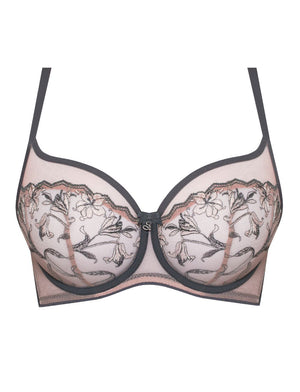 The Samanta Eliza Soft High Apex bra in graphite is a playful option for fuller busts. The High Apex style lightly showcases the bust and provides strong support. Made with embroidery and elastic tulle, this bra features a fun floral pattern and vibrant metallic details. It can be easily paired with both light and dark coloured outfits.