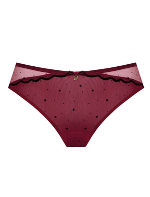 Embrace your playful side with the Samanta Melania Brazilian Brief in Claret. Featuring a delicate heart embroidery on smooth elastic tulle, this brazilian brief blends comfort and charm effortlessly.