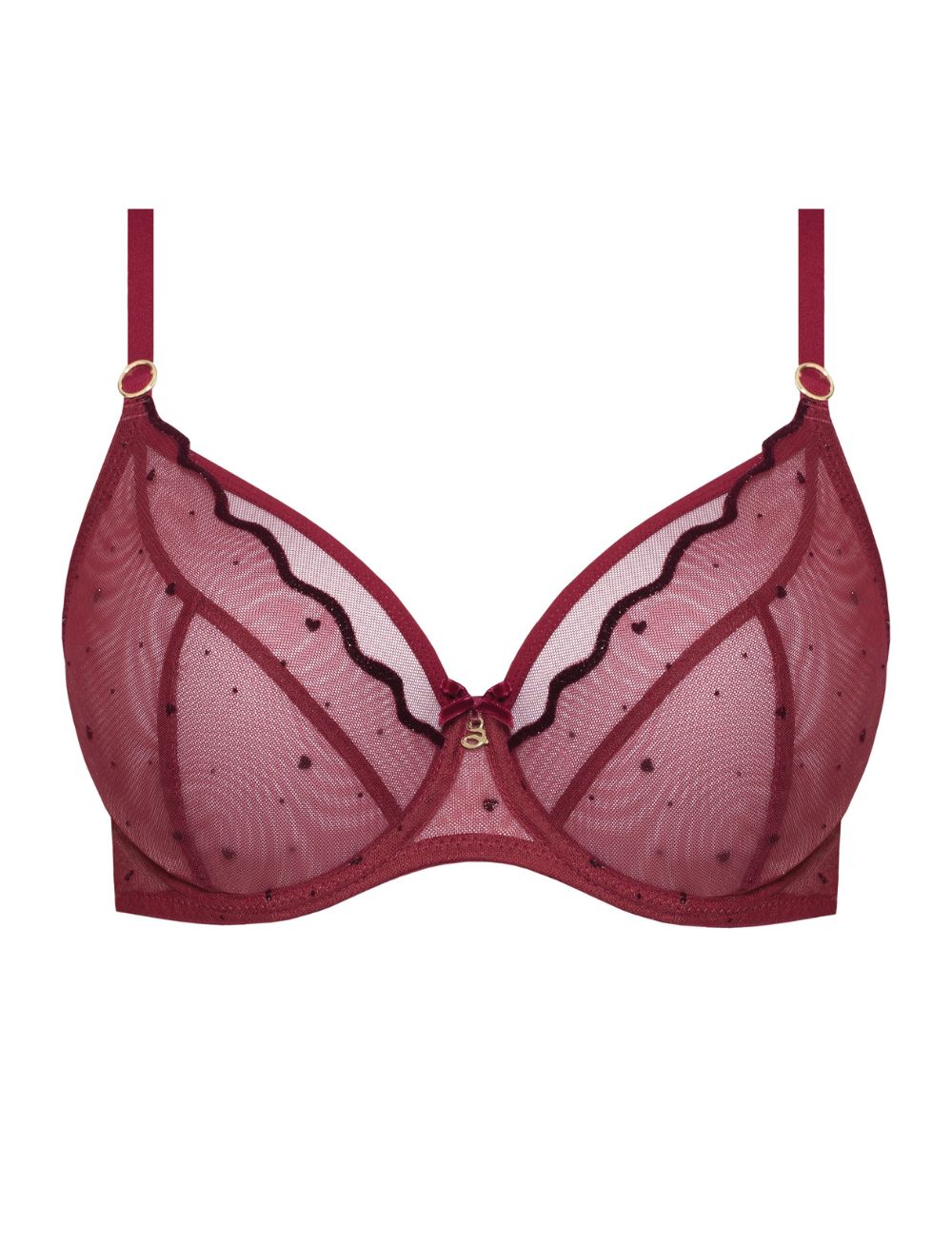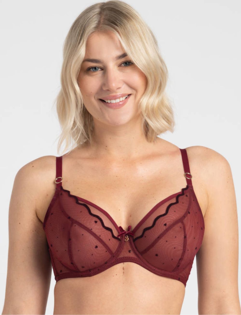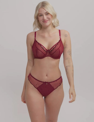 Explore the stunning Melania collection bra Samanta, the Soft Balcony Bra subtly lifts and rounds, with stable support. Delight in this rich Claret bra adorned with enchanting heart-shaped embroidery on sheer tulle—it is sure to captivate!