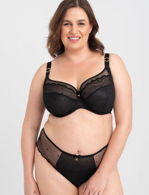 Introducing Samanta Melania Soft Full Cup Side Support Bra! This playful black collection is made of Italian flocked lace with heart decorations, guaranteed to highlight your inner glow. Deep cups provide full coverage and support for a sensual feel. Perfect for any occasion, with a touch of stardust.