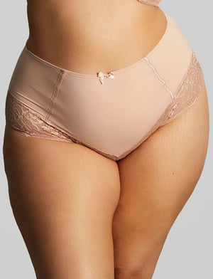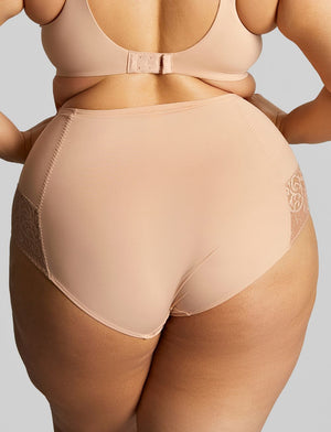 The Sculptresse Estel High Waist Brief is a great addition to every wardrobe, with unique middle-eastern inspired lace detailing and a high waist fit. These are one of our most high-waisted styles; much loved for their outstanding comfort and coverage while remaining feminine and stylish. Available in this neutral beige Honey shade, perfect for everyday wear.