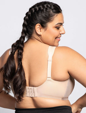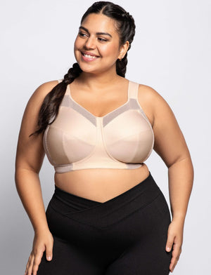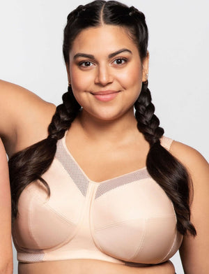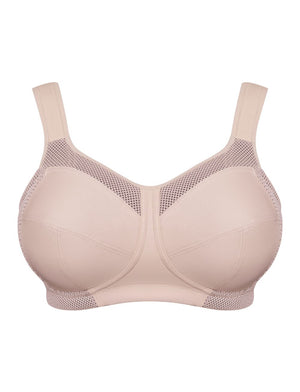 The Kate Wirefree Sports Bra by Ulla is a super supportive sports bra in a wide range of sizes. Non-wired with side support panels for added shaping and control. The upper cups are layered with tulle which moulds to your body extra for comfort. Now available in a neutral Bisque tone.