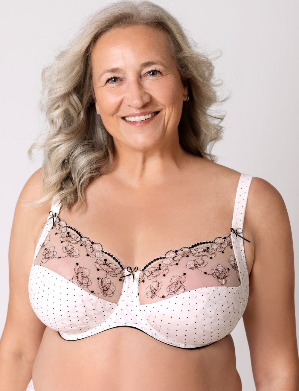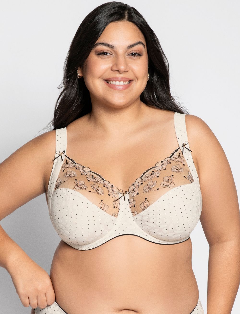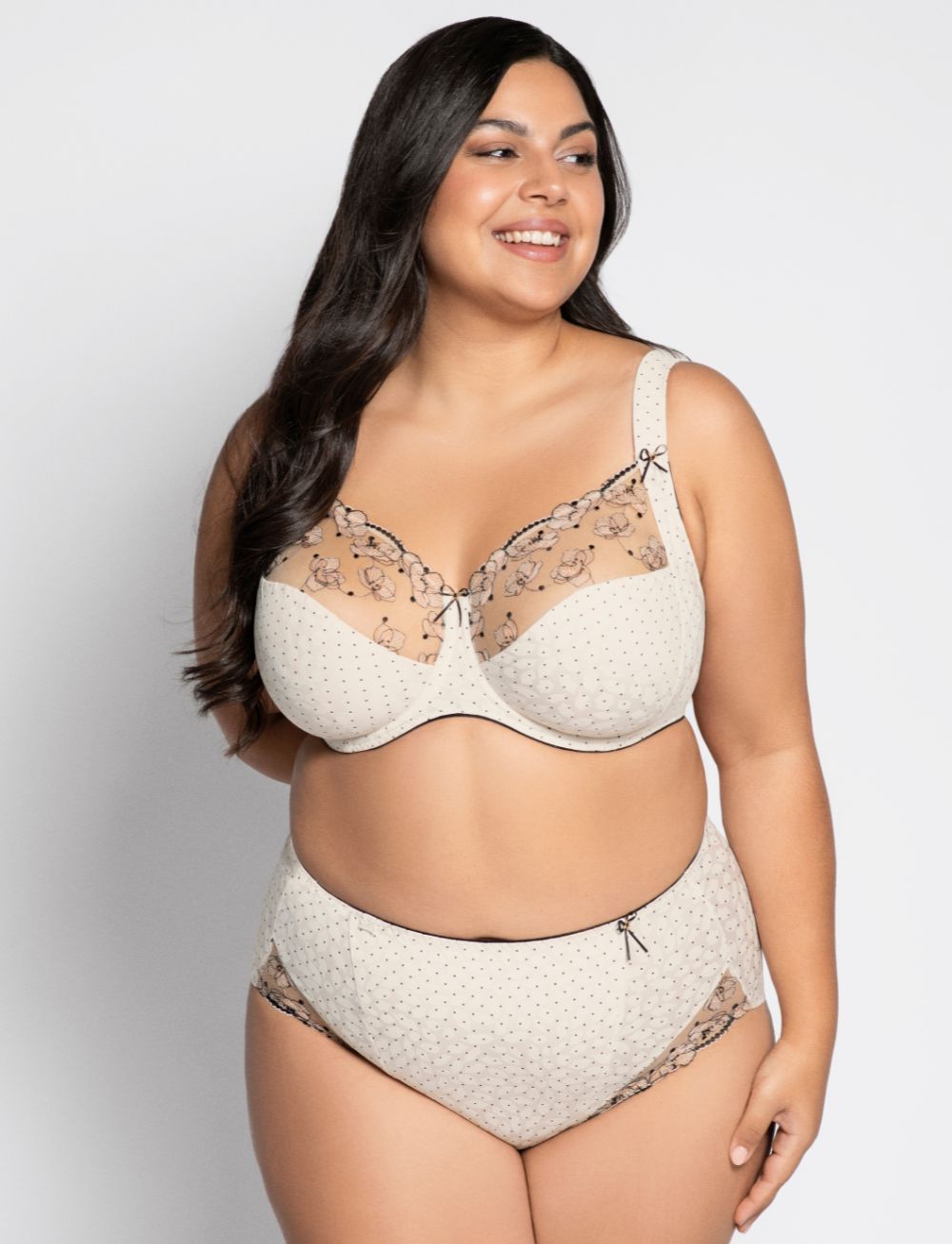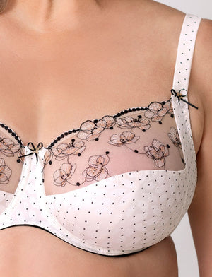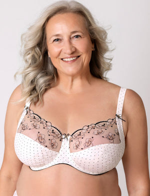 Ulla Marilyn Underwired Bra in Ivory features exquisite filigree flower embroidery across delicate tulle cups. The upper cup showcases intricate embroidered detailing, while cup H and above benefit from additional tulle lining for enhanced support. The lower cup and side panels are lined with functional, supple knitted fabric that moves with your body for all-day comfort.