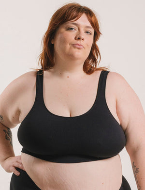 Eco-friendly and comfortable! Underwear for Humanity's Recycled Bra Crop D+ is made from recycled materials with a double layered rib construction, this bra offers comfort and style with no foam or wires! Available in classic black colourway.
