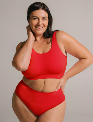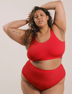 Eco-friendly and comfortable! Underwear for Humanity's Recycled Bra Crop D+ is made from recycled materials with a double layered rib construction, this bra offers comfort and style with no foam or wires! Upgrade your lingerie with this sustainable crop in this red hot Flame colourway!